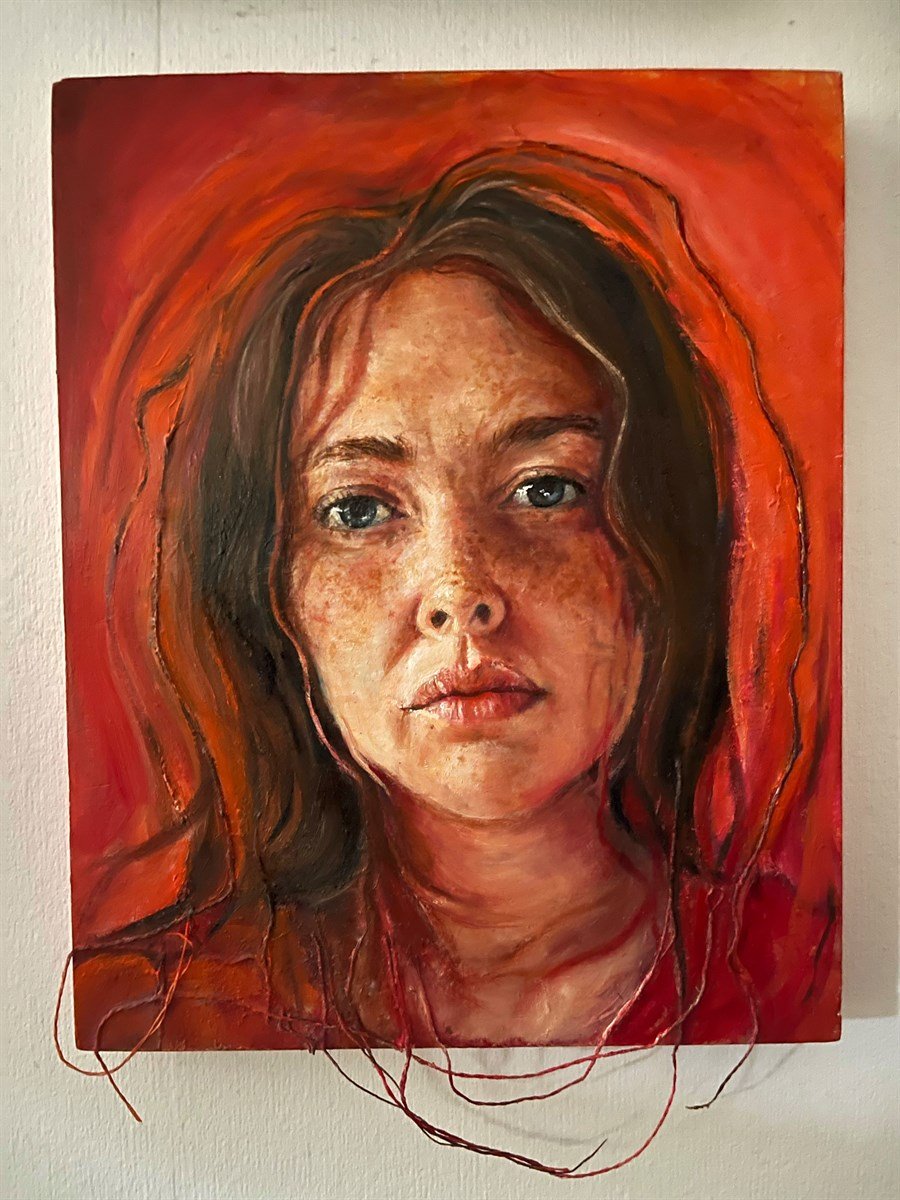 'Unravelled' is a self-portrait capturing the raw exhaustion I felt during the second week of caring for my three young children sick with gastro. I depict myself mid-unravelling - mentally, emotionally, physically - frayed yet held together by a thread of enduring love. The string embodies both the fragility and resilience of motherhood. This work gives form to the silent collapse so often hidden within the relentless, unseen labor of caregiving, especially in crisis. Despite the unravelling, there remains a quiet strength: the unwavering determination to show up, again and again.